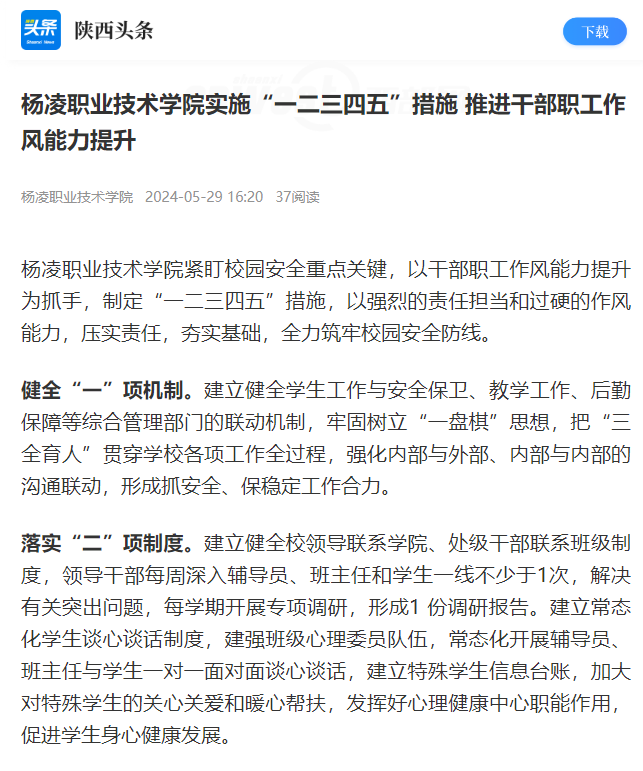“一二三四五”措施是yl23455永利官网持续落实全省“三个年”活动,进一步深化干部作风能力建设、强化学生教育管理、提高育人质效的一项重要举措。该措施自本学期实施以来,全体校领导、处级干部能够积极发挥在学生教育管理中的带动作用,下沉一线主动联系师生、解决问题;辅导员每天上午7:50-8:30在学生公寓开展工作,班主任每周深入学生公寓2次以上,辅导员、班主任与学生谈心谈话1.4万余人次,形成了辅导员和班主任自觉入住学生公寓、全面了解学生生活情况和心理状况的常态化机制;广大学生能够严格遵守校规校纪,养成良好的行为习惯,提高自我约束能力,打造了清净的校风、清正的教风、清新的学风,更筑起了校园安全防线。