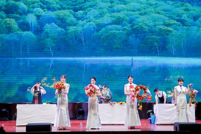“红之华美—逐梦百年”献礼建党100周年花艺技能展示项目由永利官网生态环境工程学院师生共同创作,分为现代花艺成品展示和中国传统插花现场创作两个部分。现代花艺系列作品由花环、伞花、手提花、手捧花组成,创作中融入了中国红、党旗、党徽等元素,将爱党爱国之情融入花艺。中国传统插花技艺现场展示部分为筒花、篮花和缸花三部分。筒花,名为“筑梦求真”,以直立的竹筒表现我党在100年前建党,用平伸悬空的枝条表现中国共产党为探求真理而艰难探索的历程。篮花,名为“盛世繁花”,用绣球、百合等花材,多种花材丰富的色彩,表现人民生活的安康幸福。缸花,名为“国之栋梁”,用向日葵和直立向上的青竹,表达职业教育蓬勃发展,学生技能日益精湛,成就未来国家栋梁。