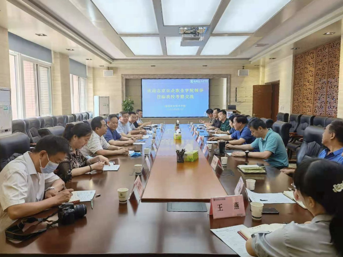 座谈会上,王周锁代表学校对王晓华一行来访表示欢迎,并介绍了学校的历史沿革和发展现状。张迪介绍了学校在人才培养、社会服务、高素质农民培养等方面取得的经验和成就。王晓华介绍了北京农业职业学院的办学经历、人才培养、产教融合、社会服务等情况。双方均表示,作为涉农高职院校,今后要加强交流学习。随后,双方与会人员围绕“十四五”规划、高职院校改革发展经验、人才培养、“放管服”改革等方面工作进行了深入交流探讨。