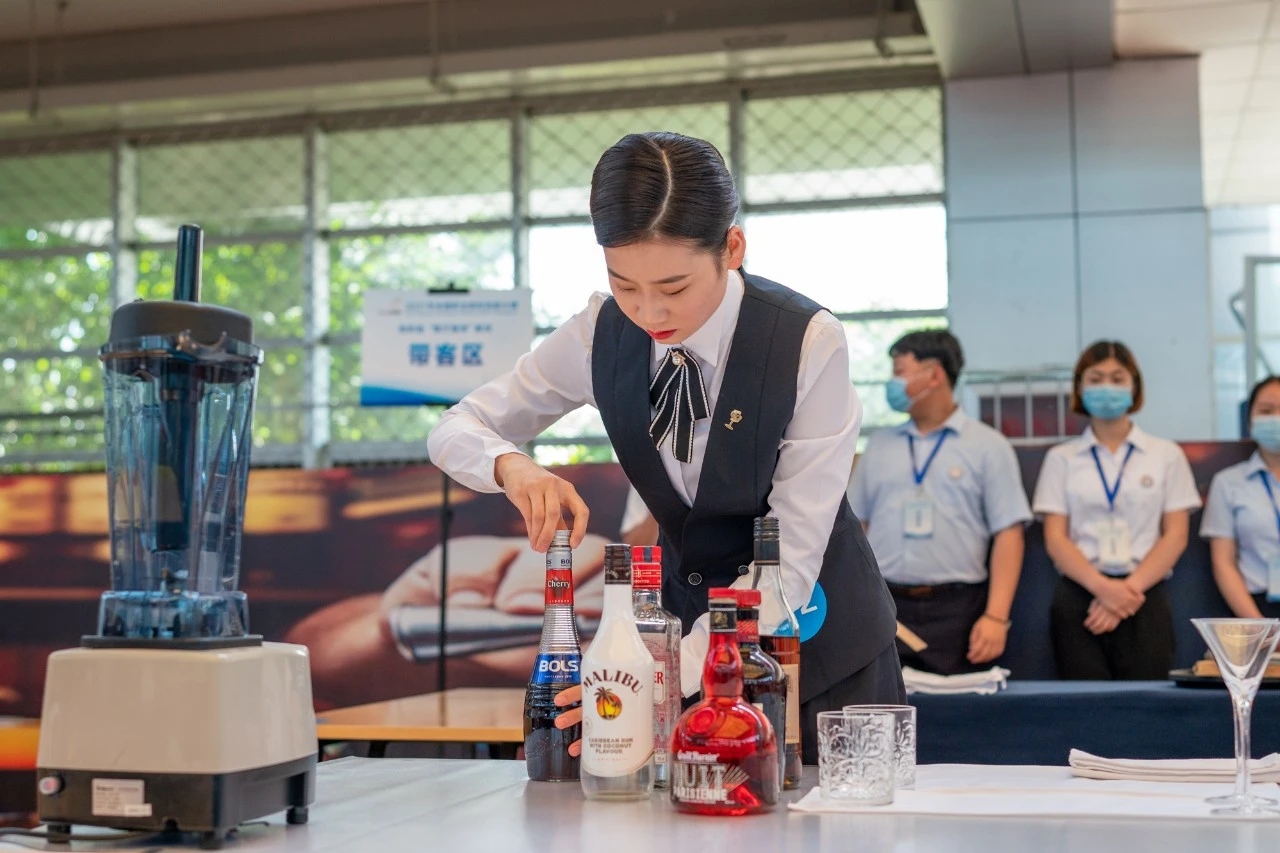 “餐厅服务”赛项由中餐服务和西餐服务两部分构成,共四个模块。其中,中餐服务分为主题宴会设计、宴会服务两个模块;西餐服务分为鸡尾酒调制与服务、休闲餐厅服务两个模块。中餐服务和西餐服务比赛时间各2个小时,由2名选手分别独自完成,赛项对标世界技能大赛标准、对接行业标准,除了考核选手的基本操作技术技能外,更侧重于选手在真实情境下对客服务时灵活应变能力等综合素养的考核。