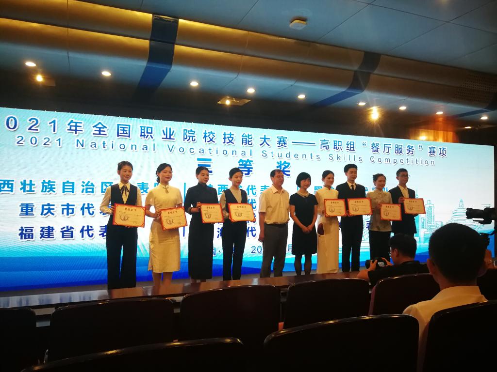 6月19日至23日,2021年全国职业院校技能大赛(高职组)“餐厅服务”赛项在青岛酒店管理职业技术学院举行,来自全国各地的32支代表队64名选手参赛。由永利官网旅游与管理学院学生汤佳佳、张莹组成的陕西省代表队获该赛项三等奖。