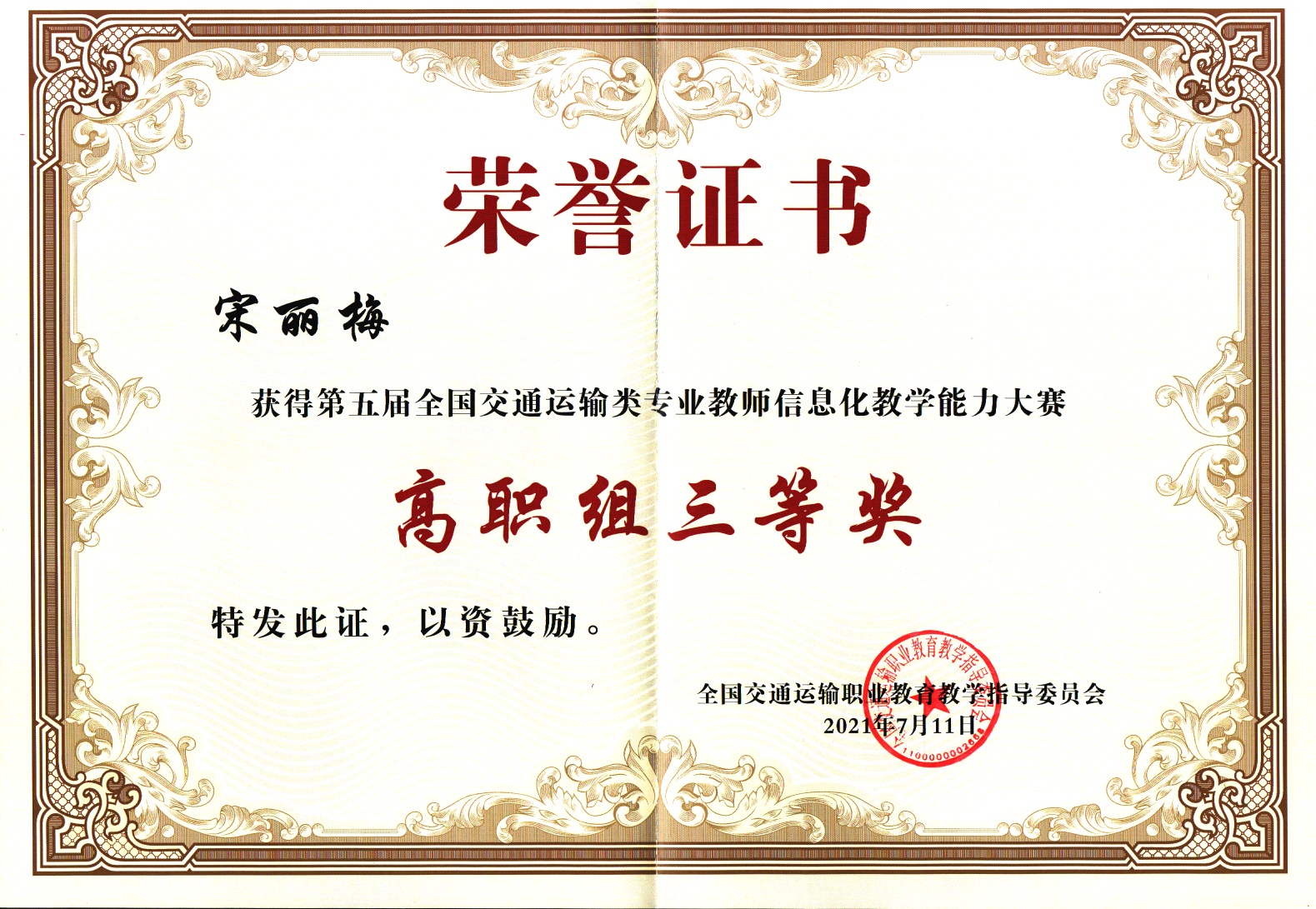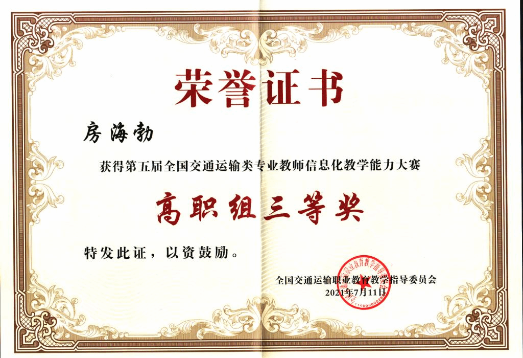 7月8日至11日,第五届全国交通运输类专业教师信息化教学能力大赛总决赛在河南交通职业技术学院举行,永利官网交通与测绘工程学院教师房海勃、宋丽梅分别获三等奖,学校获信息化教学创新典范奖。