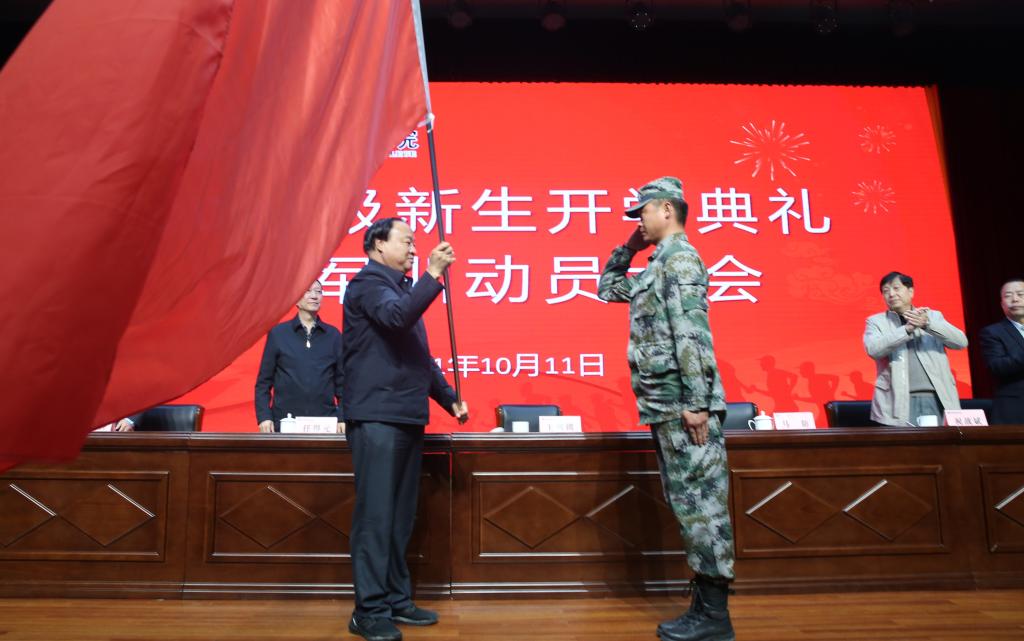 10月11日下午2:30分,伴随着庄严的国歌声,yl23455永利官网2021级新生开学典礼暨军训动员大会在南校区思辩堂举行。校长王周锁向军训团授旗并作开学讲话,本次军训团团长马防作军训动员讲话,党委副书记任得元,党委副书记、纪委书记王勇胜,副校长祝战斌、胡俊鹏出席大会。大会由党委副书记、纪委书记王勇胜主持。