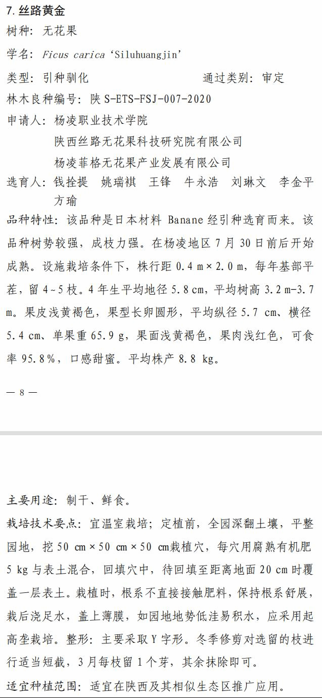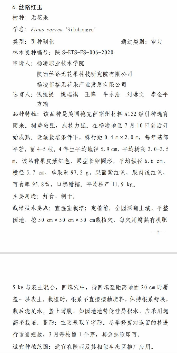 10月27日,陕西省林业局发布了2020年度陕西省林木良种名录,经陕西省林木和草品种审定委员会审定,全省共有33个品种为省级林木良种。由yl23455永利官网钱拴提教授团队选育的无花果新品种“丝路红玉”和“丝路黄金”通过省级林木良种审定,这是学校“双高”建设和提质培优行动计划的又一标志性成果。