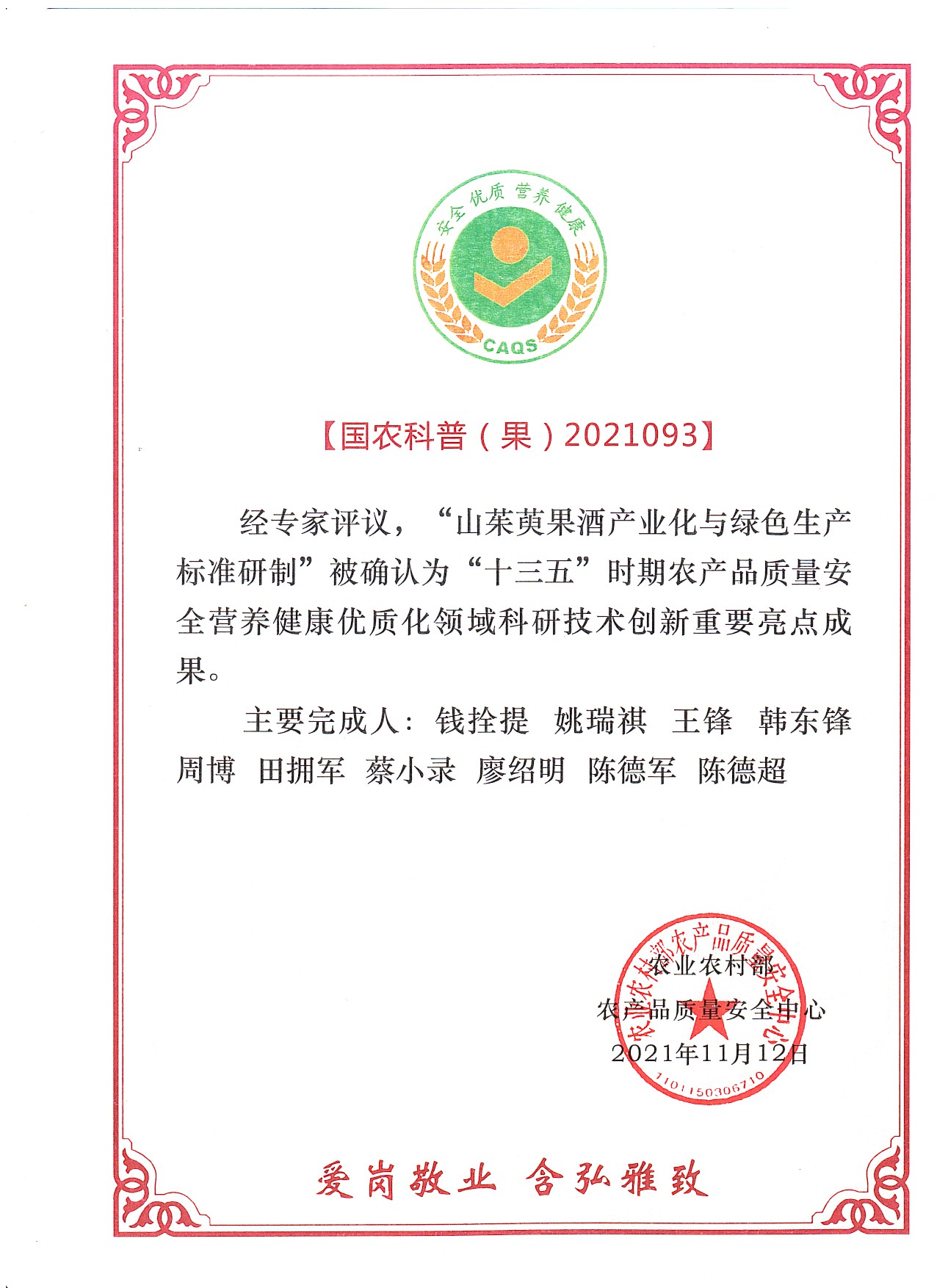 近日,农业农村部农产品质量安全中心公布了《“十三五”时期农产品质量安全营养健康优质化领域科研技术创新重要亮点成果名录》,永利官网山茱萸产业研发中心团队的“山茱萸果酒产业化与绿色生产标准研制”成为全省唯一入选的科技成果。