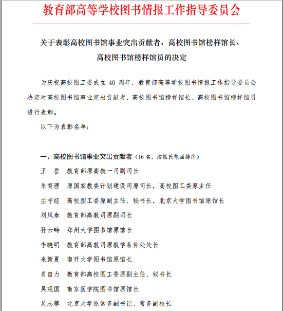 教育部高等学校图书情报工作指导委员会是在教育部领导下,对高等学校图书情报事业进行统筹、协调、咨询、研究和业务指导的专家组织。此次“榜样馆员”是由全国各高校在从事图书馆工作20年及以上且目前仍在岗的优秀馆员中推选评出,全国有198名馆员获得该项荣誉,永利官网也是全省获此殊荣的8所高校之一。