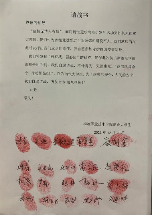 疫情就是命令,防控就是责任。在疫情防控中,以实际行动践行“若有战、召必回”的使命担当,凝聚众志成城、共克时艰的磅礴青春正能量,为广大师生做好抗疫特殊时期的服务工作。他们写下请战书,宣誓坚守岗位、严守纪律、服从指挥,与全校师生携手积极参与到学校疫情防控工作各个环节,体现了当代杨职学子的本色和担当。面对低温、寒冷的天气,他们永不退缩,积极配合学校的防疫工作,参与永利官网核酸检测的疏导工作,志愿服务,守护有我,在平凡的工作岗位上诠释着自己的初心和使命。