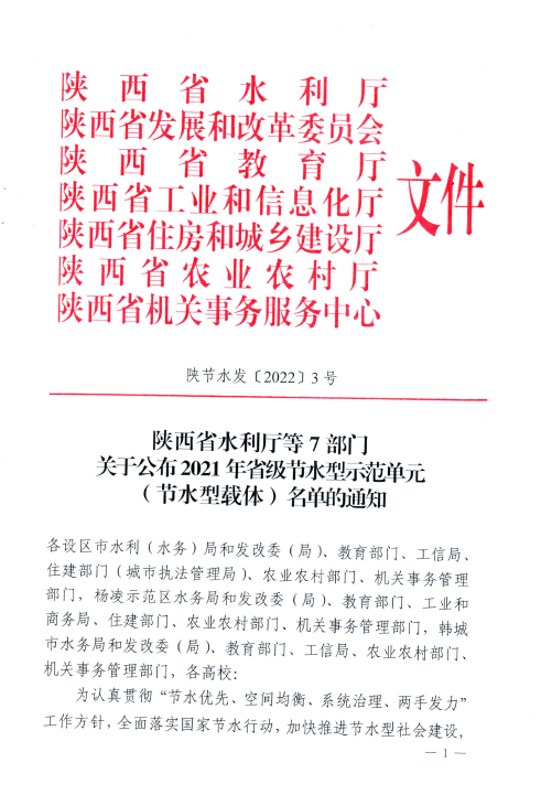 近日,陕西省水利厅公布了2021年省级节水型示范单元(节水型载体)评选结果,经自评申报、示范区核查评估、省水利厅复核、网上公示等程序,永利官网被评为省级节水型高校。