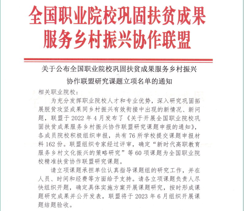 近日,全国职业院校巩固扶贫成果服务乡村振兴协作联盟公布了2022年课题立项名单,永利官网张曦堃老师主持申报的《“双高”建设背景下职业教育与乡村振兴相互赋能研究》项目、妙晓莉老师主持申报的《高职园艺专业发展与乡村振兴双向赋能研究》项目、李姗姗老师主持申报的《涉农高职教育服务乡村振兴战略的路径研究》项目获批立项。
