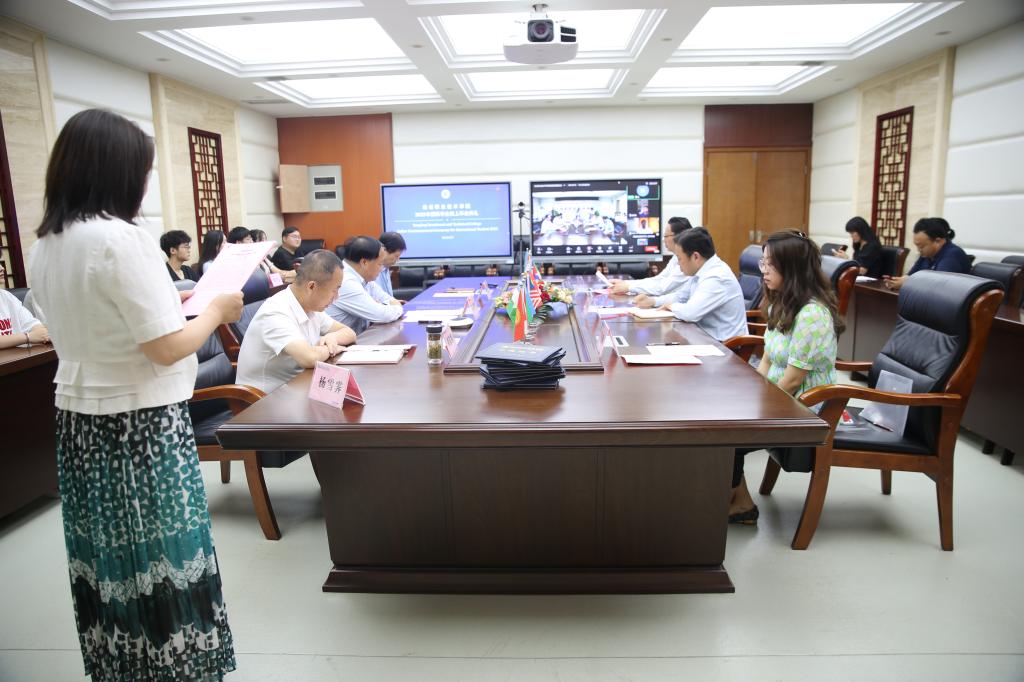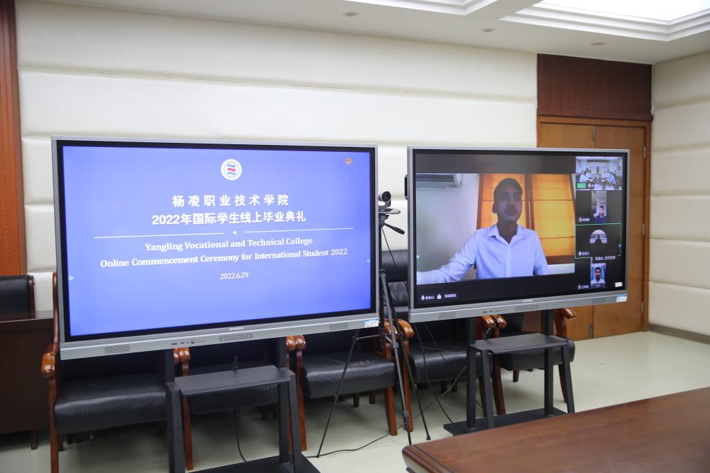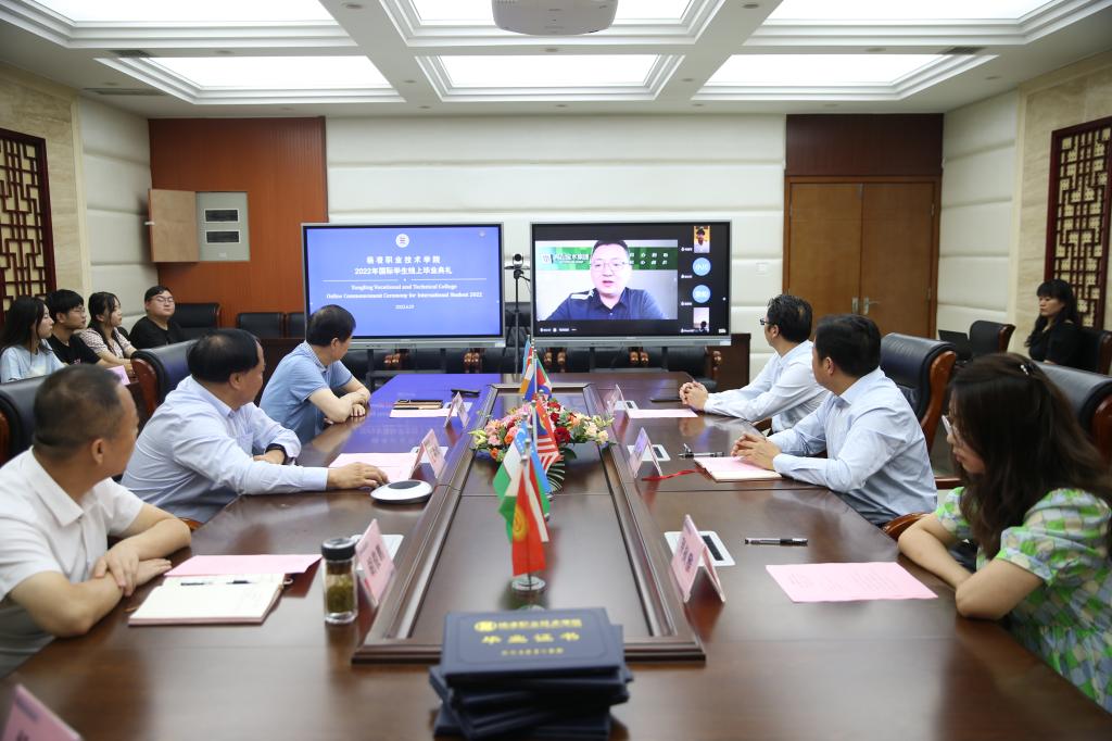 6月29日,yl23455永利官网2022年国际学生线上毕业典礼在南校区204会议室举行。校长王周锁,高山流水集团总经理徐小川(线上),副校长祝战斌、胡俊鹏,党委委员、宣传部部长裴红波,国际学院院长杜斌出席了典礼。国际学院教师及2019级全体国际学生毕业生(线上),国内学生代表等参加了典礼。国际学院副院长杨雪霁主持毕业典礼。