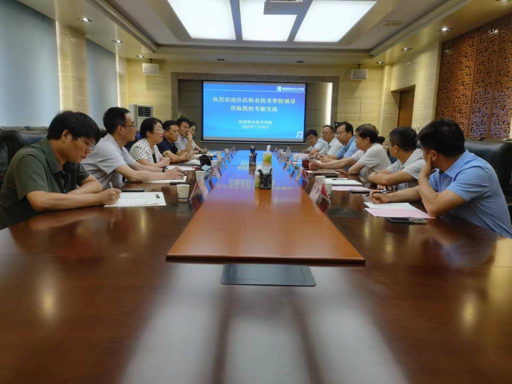 7月30日上午,许昌职业技术学院副院长郭玉萍一行6人来永利官网,就双高建设、社会服务、对外培训等工作进行考察交流。学校副校长祝战斌,党委委员、党政办公室主任张朝晖陪同考察并座谈交流,发展规划处、继续教育与培训学院、机电工程学院、信息工程学院等相关部门负责人参加了座谈会。