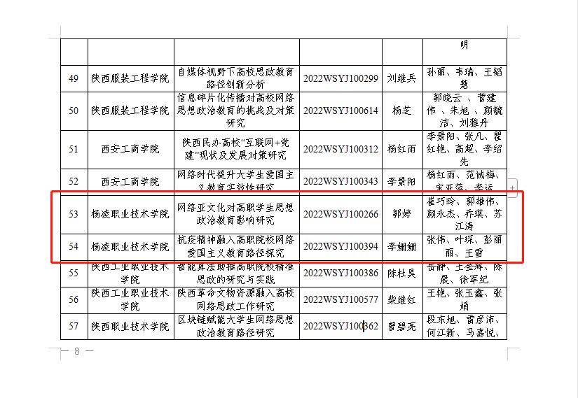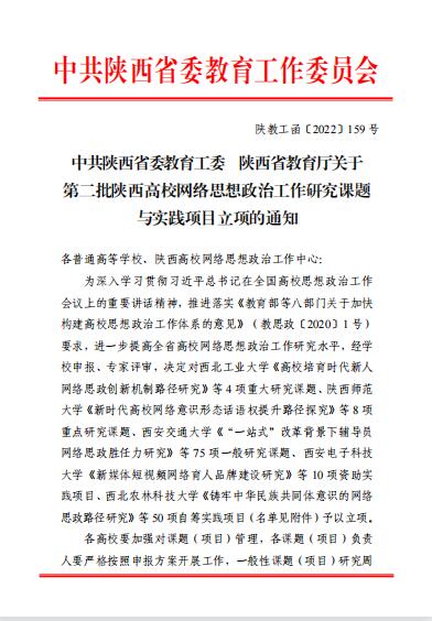 近日,省委教育工委、省教育厅公布第二批陕西高校网络思想政治工作研究课题与实践项目立项名单,永利官网马克思主义学院郭婷老师主持的课题《网络亚文化对高职学生思想政治教育影响研究》、马克思主义学院李姗姗老师主持的课题《抗疫精神融入高职院校网络爱国主义教育路径探究》获第二批陕西高校网络思想政治工作研究课题与实践项目一般研究课题立项。