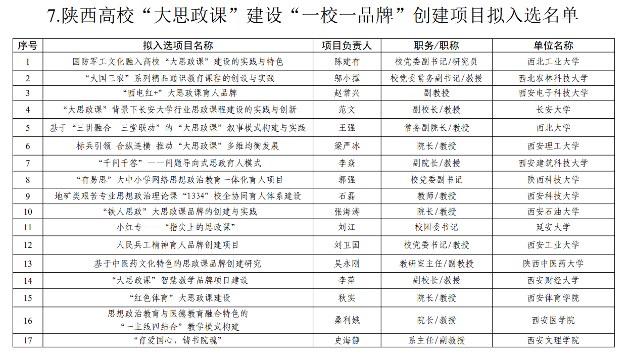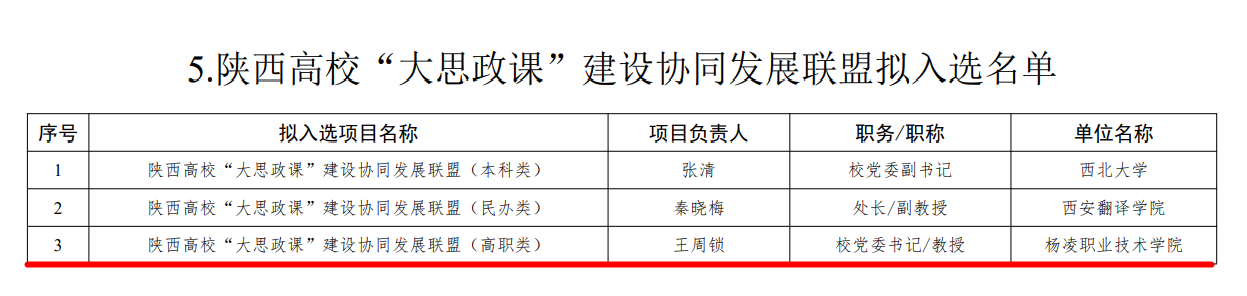 10月28日,省委教育工委、省教育厅对陕西省“大思政课”建设试点项目评审结果进行公示,永利官网党委书记王周锁牵头负责陕西高校“大思政课”建设协同发展联盟(高职类)建设,党委副书记任得元负责的《实施“正禾”育人工程 构建思政课实践大课堂》入选陕西高校“大思政课”建设“一校一品牌”创建项目。