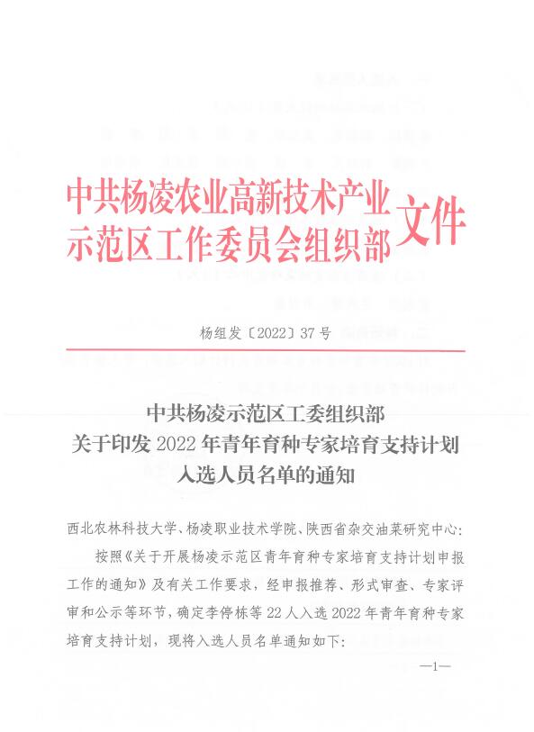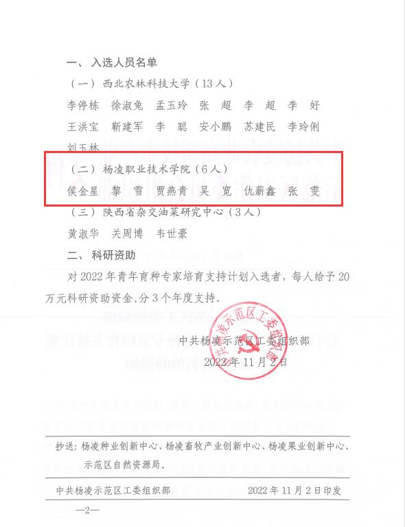 11月3日,杨凌示范区召开青年育种专家座谈会,宣布2022年青年育种专家培育支持计划入选名单,永利官网侯金星、贾燕青、黎雪、仇薪鑫、吴宽、张雯等6人入选2022年青年育种专家培育支持计划。副校长胡俊鹏出席座谈会,张雯、侯金星代表入选人员做表态发言。