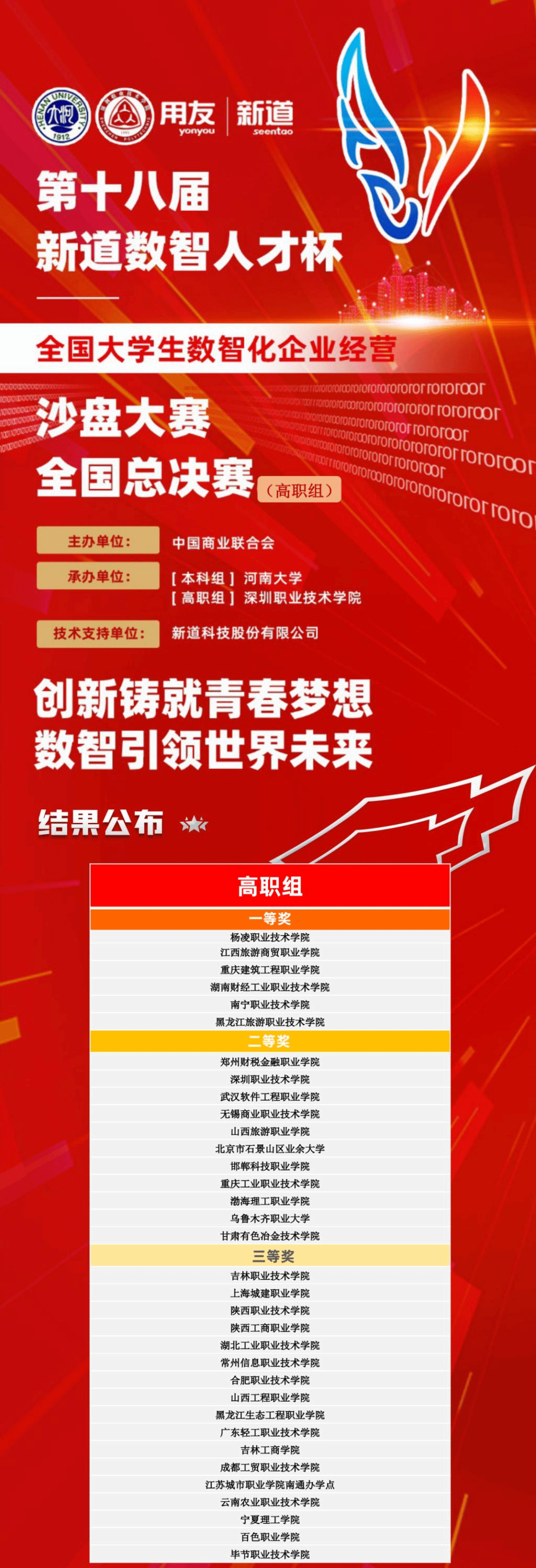 11月12日,第十八届“新道数智人才杯”全国大学生数智化企业经营沙盘大赛全国总决赛(高职组)圆满结束,经过一天的激烈的角逐,永利官网经济与贸易学院学生王家乐、刘虹池、鲁文杰、冯迎亮组成的参赛队以第一名的优异成绩荣获全国总决赛一等奖,这是永利官网在此赛项上取得的历史最好成绩。