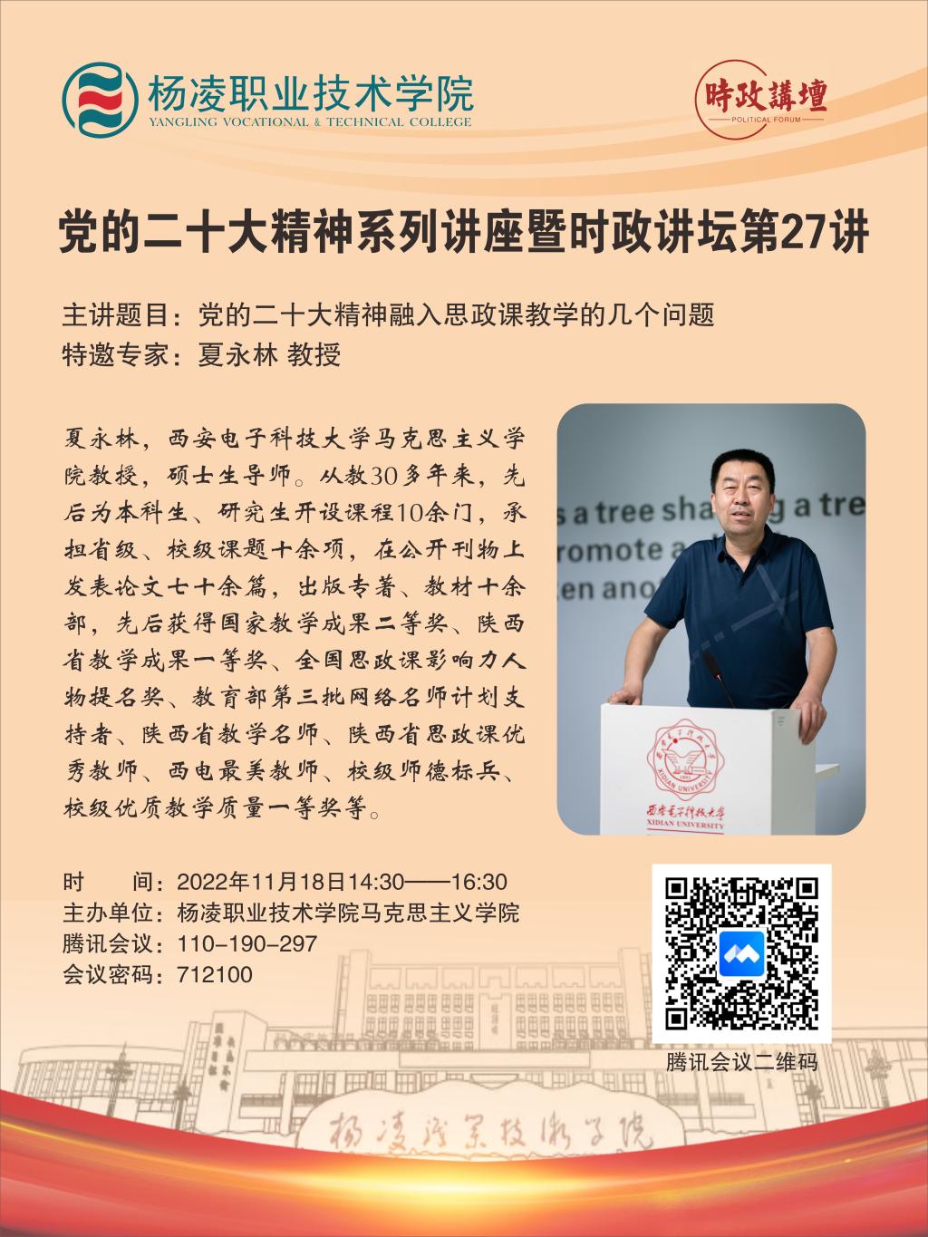 11月18日下午,党的二十大精神系列讲座暨时政讲坛第27讲在永利官网举办。讲坛邀请西安电子科技大学马克思主义学院原党委书记夏永林教授作题为“党的二十大精神融入思政课教学的几个问题”的主题报告。报告通过线上形式进行,国内20多所学校近300名思政课教师聆听了报告。