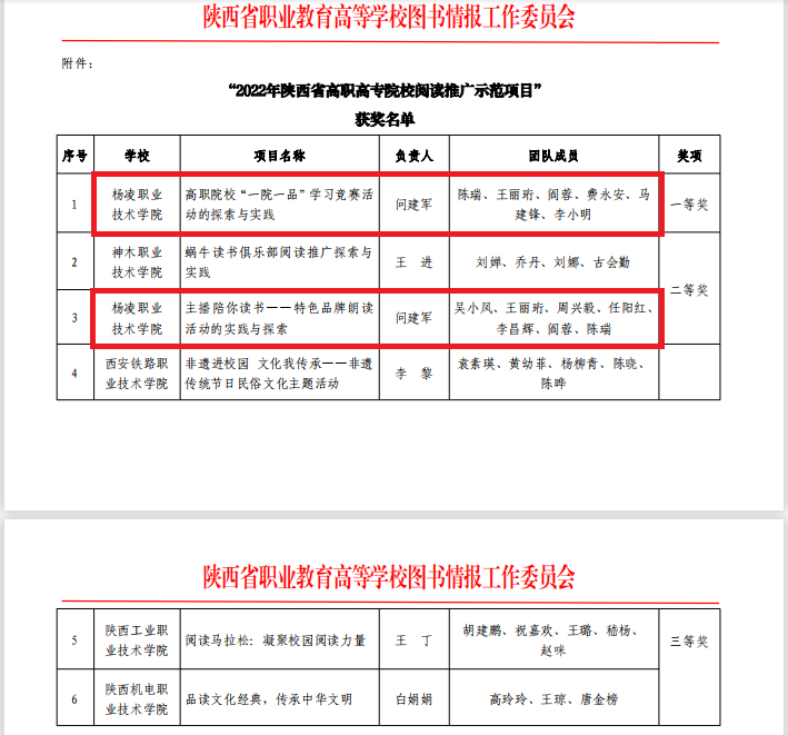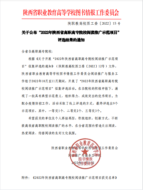 近日,陕西省职业教育高等学校图书情报工作委员会公布了“2022年陕西省高职高专院校阅读推广示范项目”评选结果。永利官网申报的“高职院校‘一院一品’学习竞赛活动的探索与实践”、“主播陪你读书——特色品牌朗读活动的实践与探索”项目分别获一等奖、二等奖。