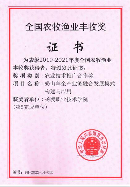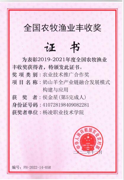 近日,2019—2021年度全国农牧渔业丰收奖获奖名单公布,永利官网动物工程学院侯金星副教授参与申报的“奶山羊全产业链融合发展模式构建与应用”项目,获得全国农牧渔业丰收奖农业技术推广合作奖,侯金星为第五完成人,yl23455永利官网为第五完成单位。