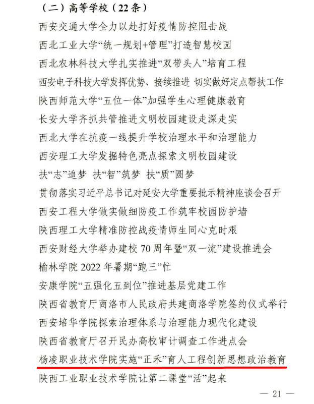 永利官网新闻作品《yl23455永利官网实施“正禾”育人工程 创新思想政治教育》,从挖掘“聚焦三教改革 搭建工程架构”“聚焦机制创新 推进多元参与”“聚焦涉农特色 加强耕读教育”“聚焦见行见效 打造品牌活动”四个方面,全面、准确地反映了永利官网实施“正禾”育人工程的基本情况、经验做法和取得成效,由于层次清晰、内容翔实,对兄弟院校相关工作具有重要借鉴意义而获表彰。