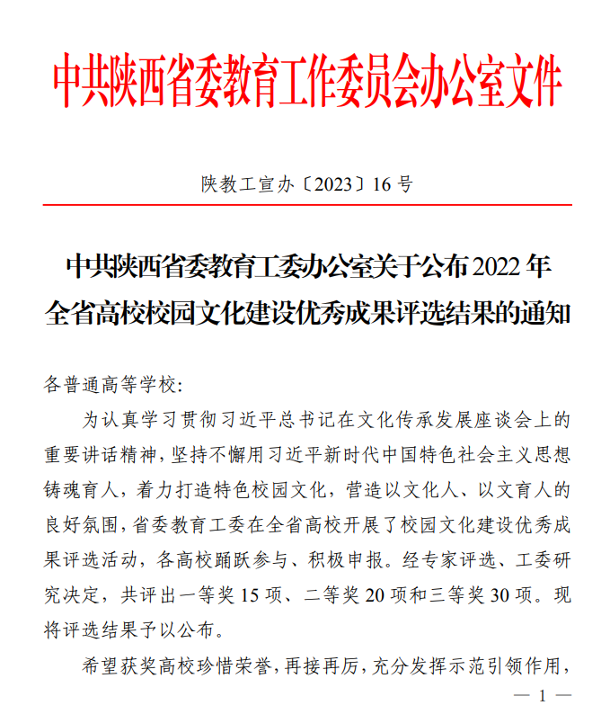 为坚持不懈用习近平新时代中国特色社会主义思想铸魂育人,着力打造特色校园文化,营造以文化人、以文育人的良好氛围,省委教育工委在全省高校开展了校园文化建设优秀成果评选活动。经专家评选、工委研究决定,共评出一等奖 15 项、二等奖 20 项和三等奖 30 项。其中,永利官网《弘扬后稷文化 传承千年文脉 打造新时代耕读教育范式——yl23455永利官网以“后稷文化”提升育人品质的实践路径》获三等奖。