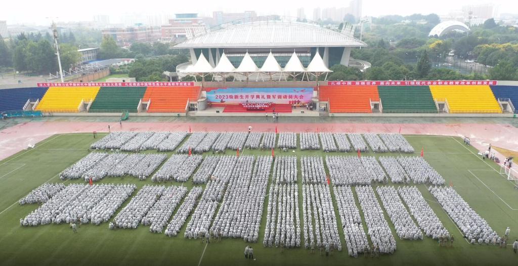 副校长蒋平江、胡俊鹏,省级以上优秀教师、教学名师、师德标兵、杰出人才、三级教授等教师代表,各二级学院、各处室负责同志,2023级新生,以及军训教官等近6000人参加开学典礼暨军训动员大会。