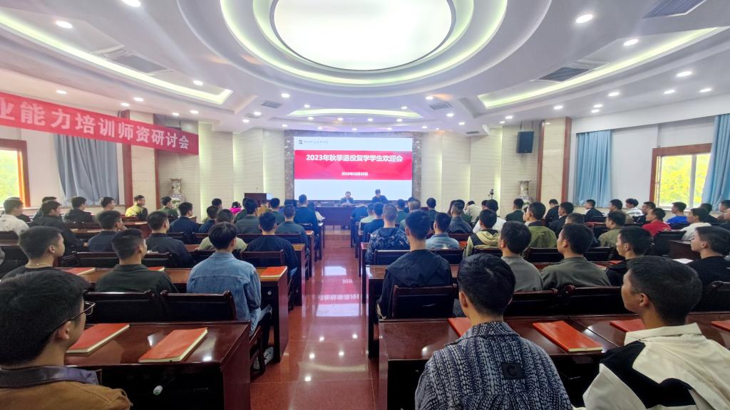 10月10日下午,永利官网在水韵楼报告厅举行2023年退役复学大学生欢迎仪式。学工部部长陈军峰、征兵与国防教育科工作人员、各学院相关负责人,以及2023年104名退役复学大学生参加了仪式。