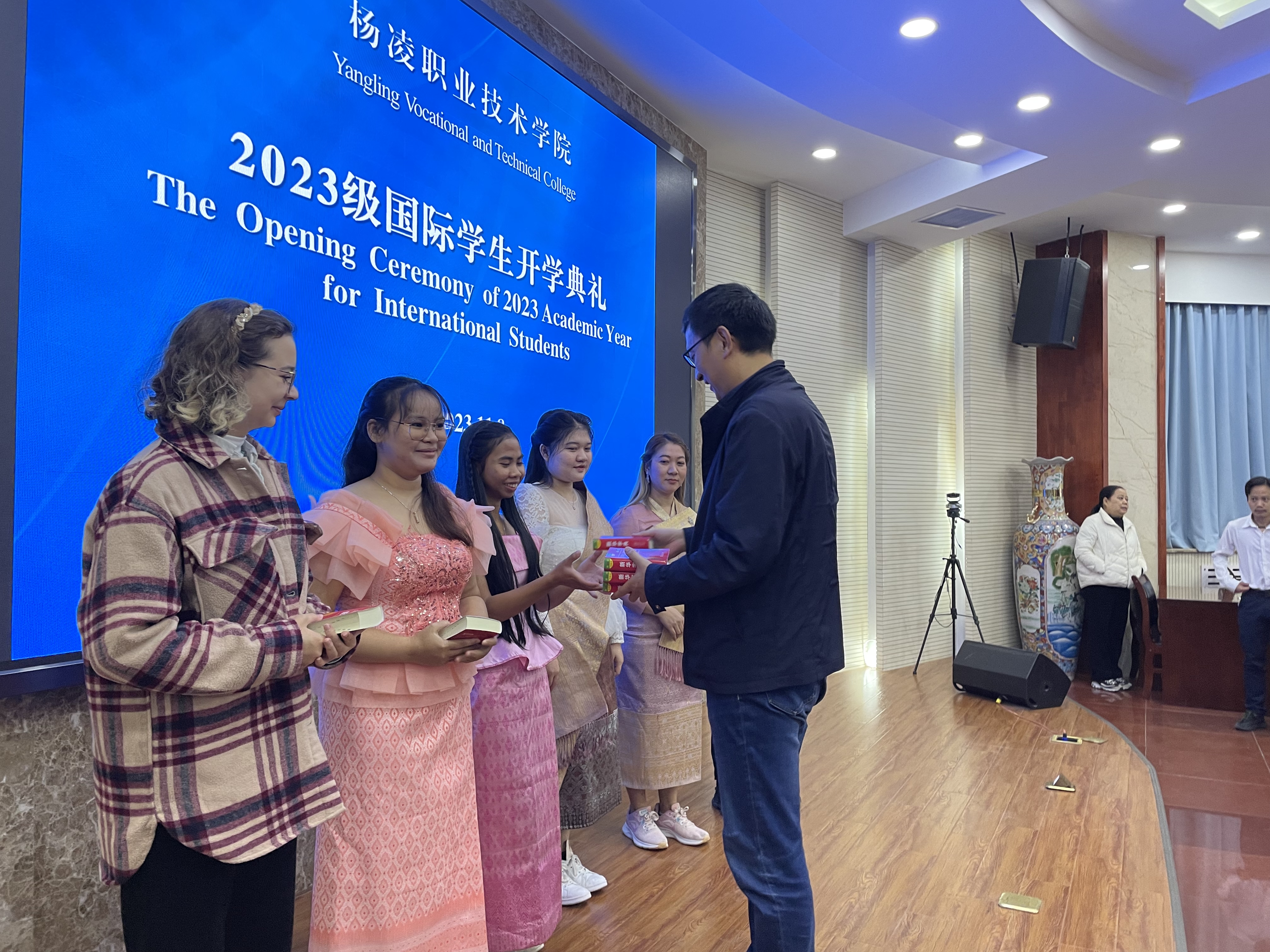 副校长蒋平江向国际学生赠送中文学习字典