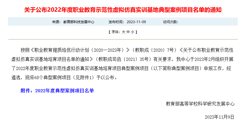 11月9日,教育部高等学校科学研究发展中心公布了2022年度职业教育示范性虚拟仿真实训基地典型案例项目名单。永利官网《“育、训、创、赛、研”五位一体,打造智慧农业示范性虚拟仿真实训基地新样板》项目成功入选,全国共68个典型案例项目入围。