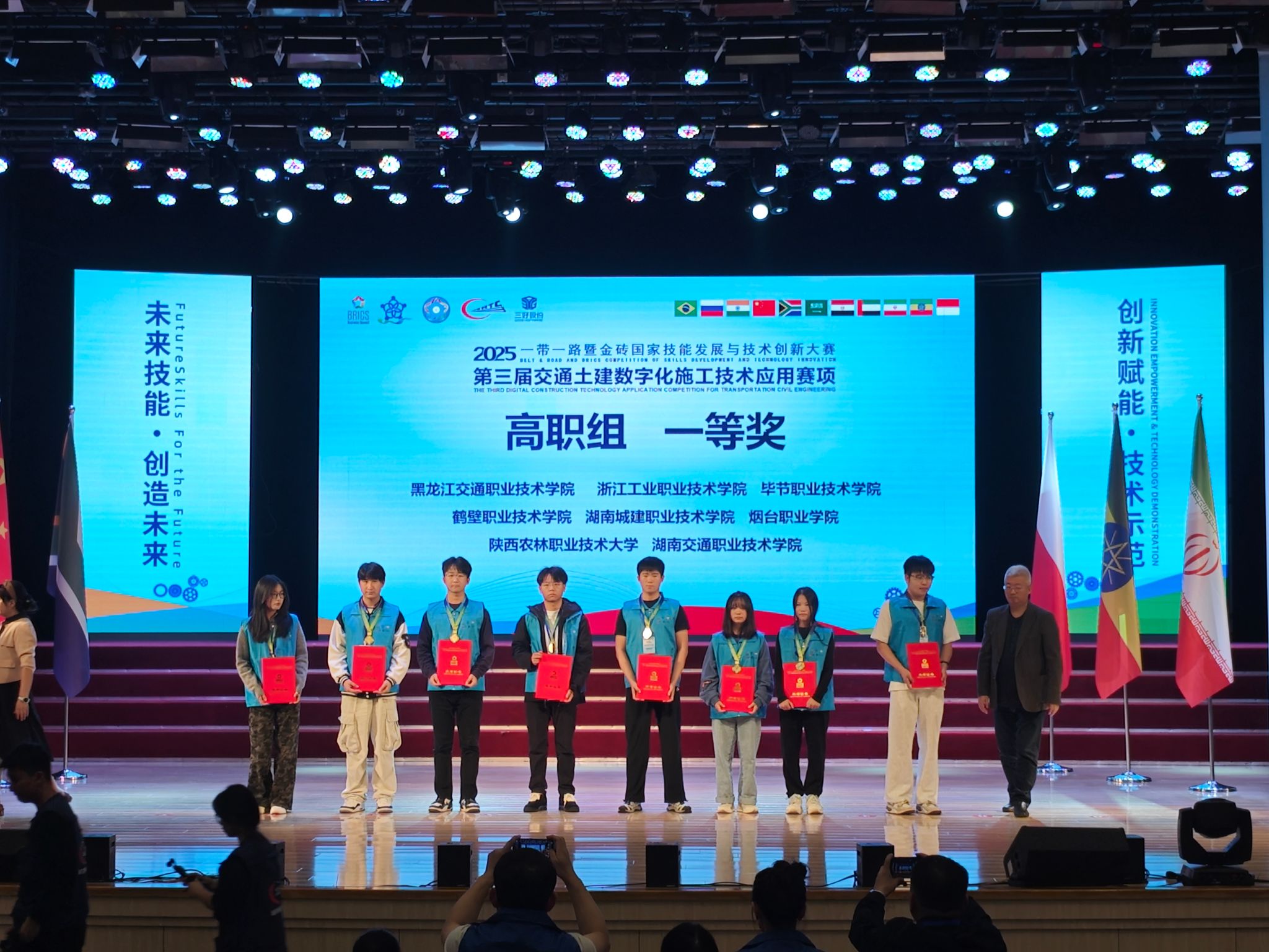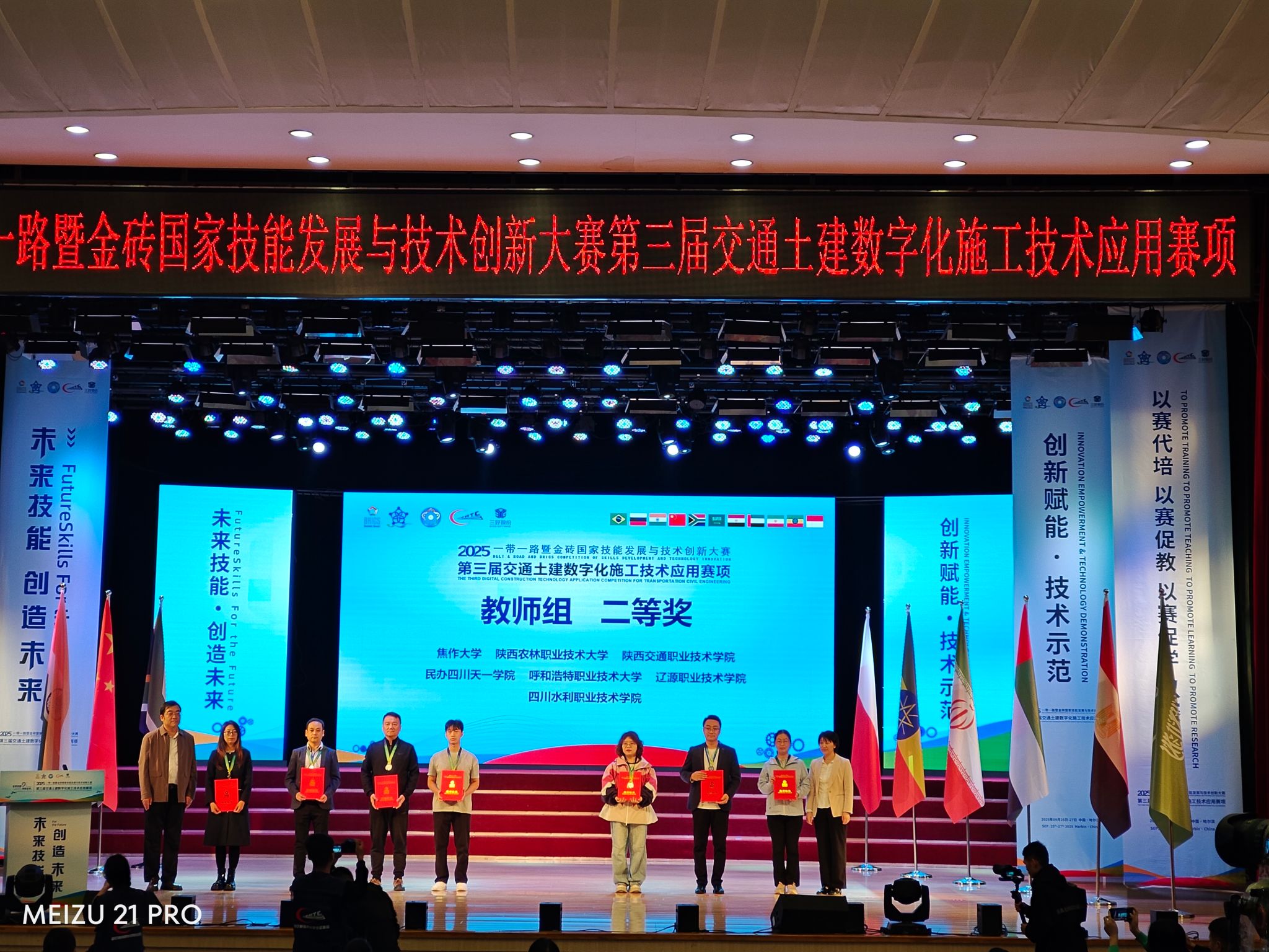 9月25日至27日,2025一带一路暨金砖国家技能发展与技术创新大赛第三届交通土建数字化施工技术应用赛项全国总决赛在哈尔滨铁道职业技术学院成功举办。本次大赛以“未来技能・创造未来”为主题,吸引了全国141所院校253支队伍同台竞技。经过激烈角逐,永利官网交通与测绘工程学院道路与桥梁工程技术专业董雄辉、黄家豪两名同学获得高职组一等奖,教师穆江飞获教师组二等奖,学校获最佳组织奖、优秀组织奖,指导教师穆江飞和吴彩星获优秀指导教师。