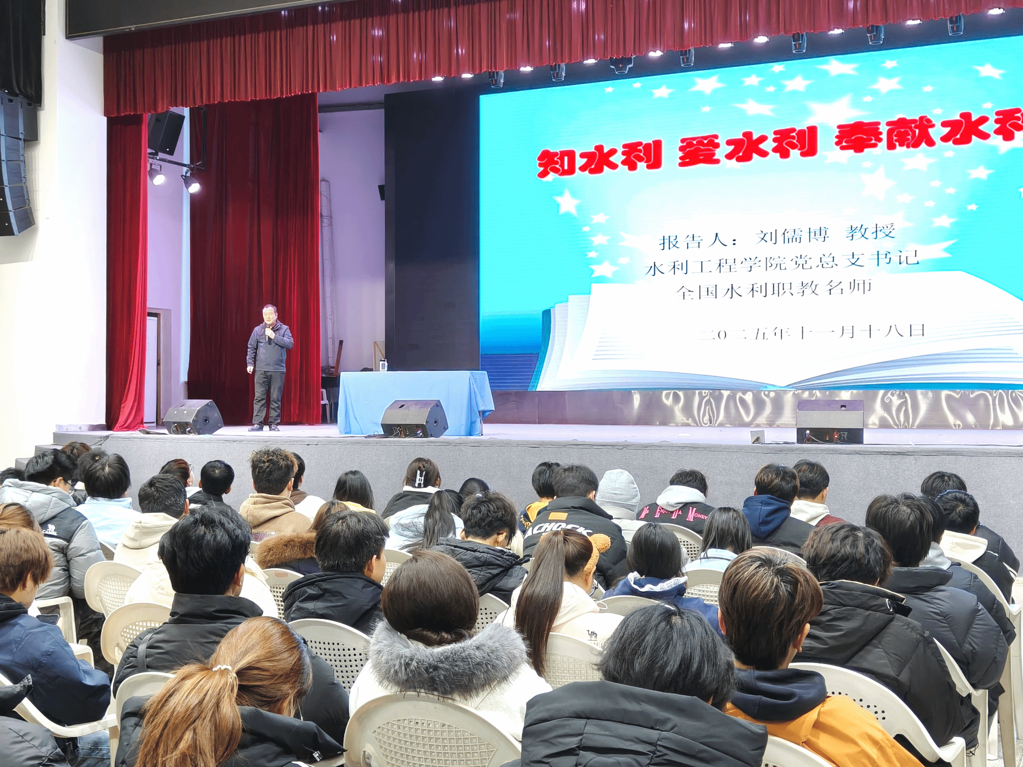 11月18日晚,全国水利职教名师、水利工程学院党总支书记刘儒博教授在南校区一卡通为全体2025级新生带来了一场题为“知水利 爱水利 奉献水利”的主题报告。